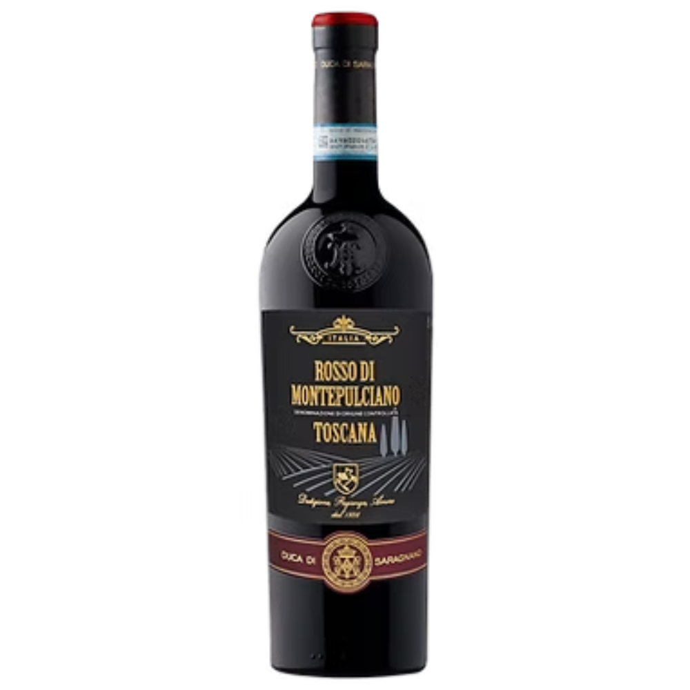 Paladar: Na boca, o Duca di Saragnano é seco e pleno, oferecendo uma experiência gustativa equilibrada e harmoniosa. A acidez proporciona frescor e vivacidade, enquanto o baixo teor de açúcar mantém a secura predominante. Os taninos são presentes, mas bem integrados, contribuindo para a estrutura sem serem agressivos. O sabor prolonga-se no paladar, refletindo as frutas e especiarias detectadas no nariz.